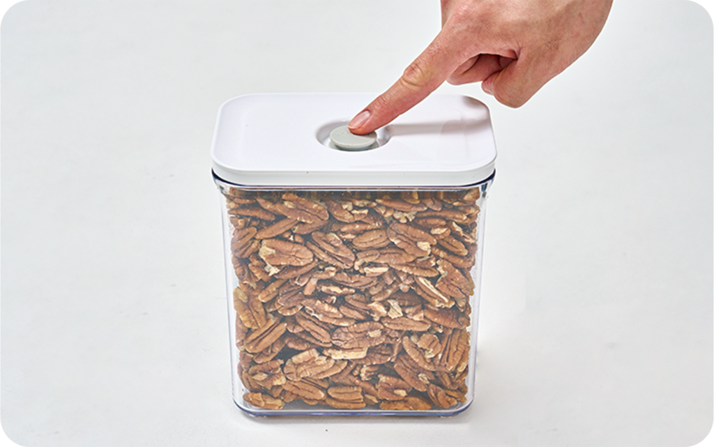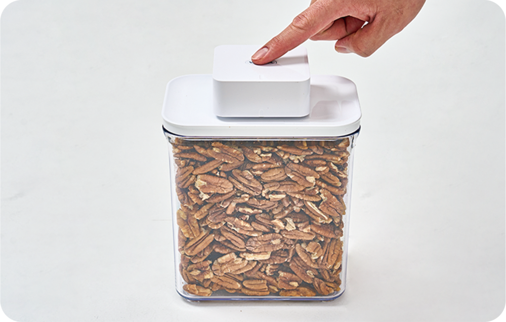 確認內容物沒有超出七分滿後,將盒蓋蓋上並 輕壓使其密合。接著,按下並關閉蓋上的氣閥鈕,這時保鮮盒會進入半真空狀態,接下來就可以進入真空步驟囉!