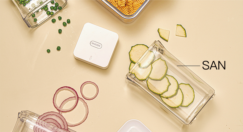 盒身則使用韓國製【SAN 材質】(苯乙烯-丙烯腈共聚物),擁有優異的剛性與光澤,外觀質感清透。相比其他材質的真空保鮮盒,SAN 不僅重量更輕、不易染色,也不容易殘留食物氣味,加上本身硬度高,更加耐用,是兼具美觀與實用性的理想選擇。此外,材質通過 BPA Free 認證,不含雙酚 A,屬於天然且環保的食品級用料,安全無毒、使用安心,讓日常保鮮更有保障。