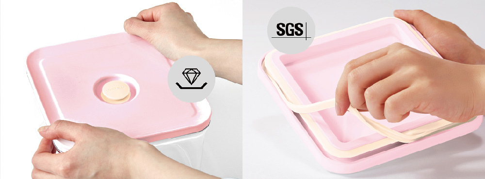 上蓋設計採用雙層矽膠圈,搭配【*食品級 ABS 樹脂】材質,密封性更佳。即使不使用真空機,只要蓋上盒蓋、按下氣閥,就能產生基本的密封效果,有效隔絕空氣。