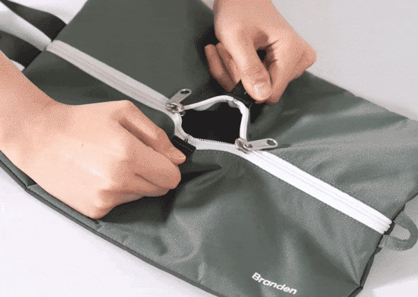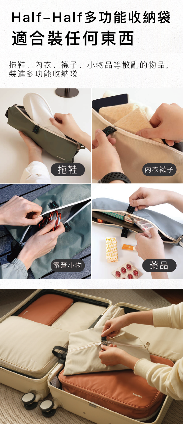 Branden Half-Half 多功能收納袋採分層結構設計,上下可獨立使用,收衣、裝鞋都OK。防潑水材質+立體結構,讓行李更整齊。