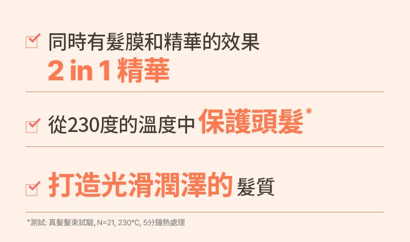 富含摩洛哥堅果油等7大植萃成分(摩洛哥油、堅果油、椰子油、荷荷芭籽油、橄欖油、杏仁油、樺樹籽油),濕髮時使用!免等待、免沖洗!讓秀髮維持光滑柔順!讓髮絲滋養潤澤、加倍營養,抗熱可高達230度C。