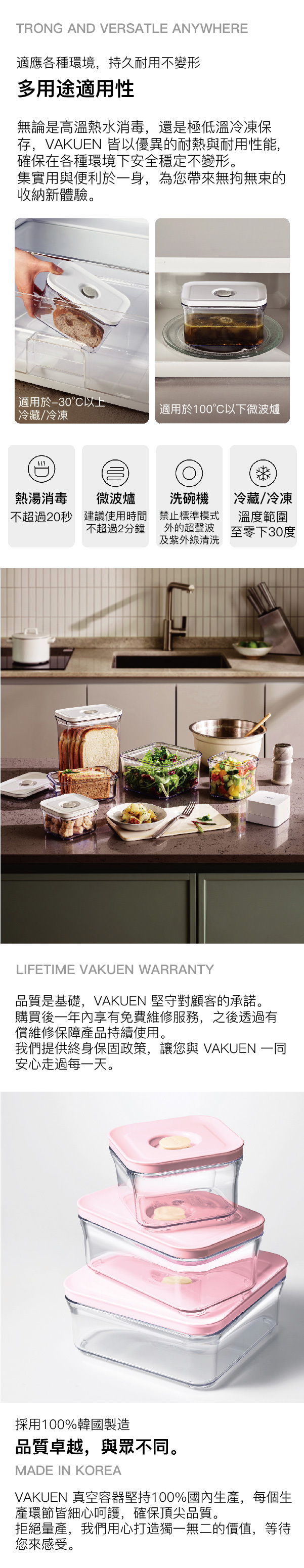 VAKUEN 智能真空密封保鮮盒4入組,包含 Basic 0.5L、Basic 1.0L、High 1.0L 及 High 2.0L,多尺寸選擇,全面覆蓋食材保存需求,為您鎖住每分鮮味。