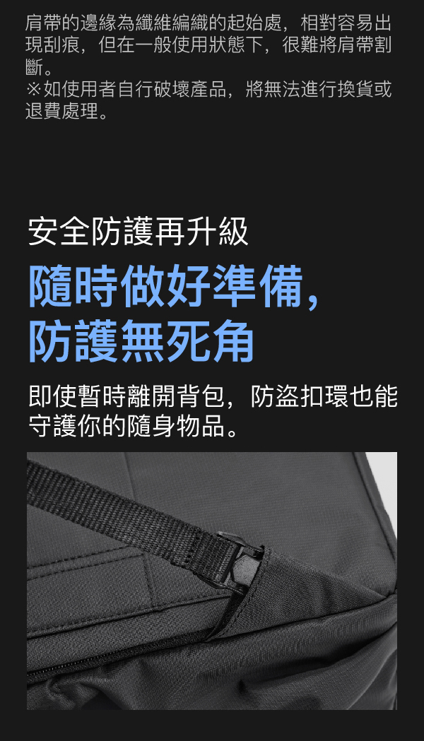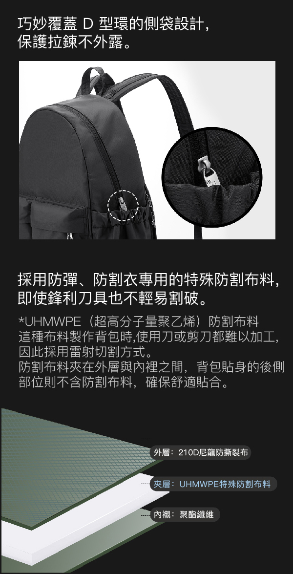 結合 防割材質、RFID 防護、雙重鎖扣,提供全方位安全保障;