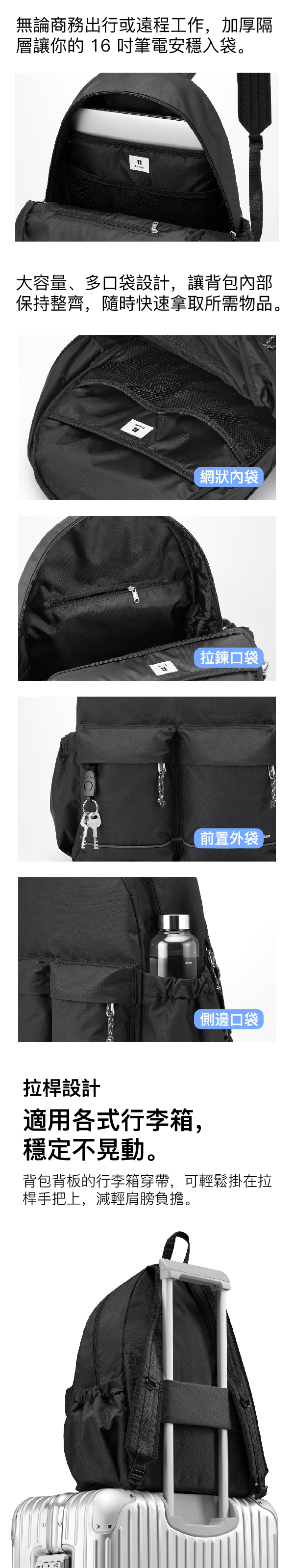 多口袋設計與筆電隔層,讓收納井然有序;